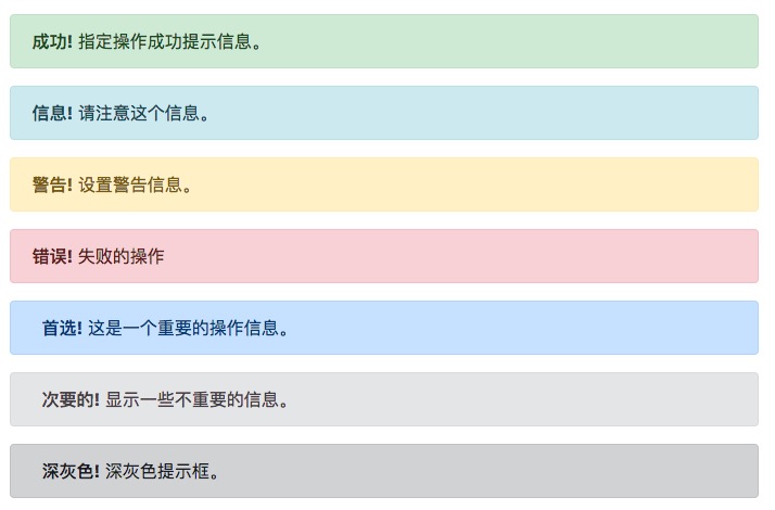 提示框可以使用 .alert 类, 后面加上 .alert-success, .alert-info, .alert-warning, .alert-danger, .alert-primary, .alert-secondary, .alert-light 或 .alert-dark 类来实现: