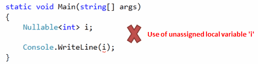 例如,声明并使用以下int类型的nullable而不分配任何值。编译器将给出“使用未分配的局部变量'i'”错误: