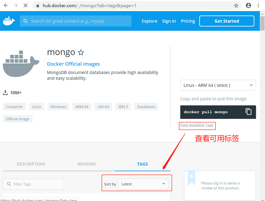 可以通过 Sort by 查看其他版本的 MongoDB,默认是最新版本 mongo:latest。