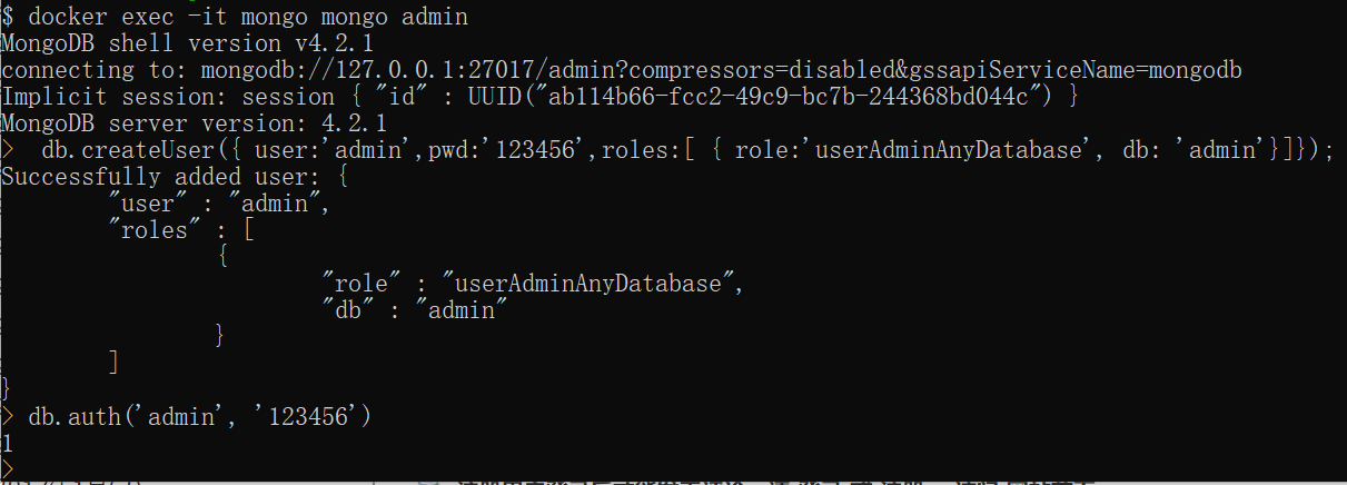 > db.createUser({ user:'admin',pwd:'123456',roles:[ { role:'userAdminAnyDatabase', db: 'admin'},"readWriteAnyDatabase"]});