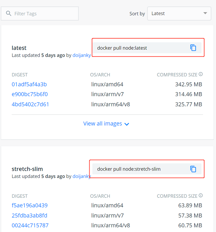 可以通过 Sort by 查看其他版本的 Node,默认是最新版本 node:latest。
