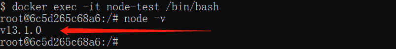 $ docker exec -it node-test /bin/bash root@6c5d265c68a6:/# node -v