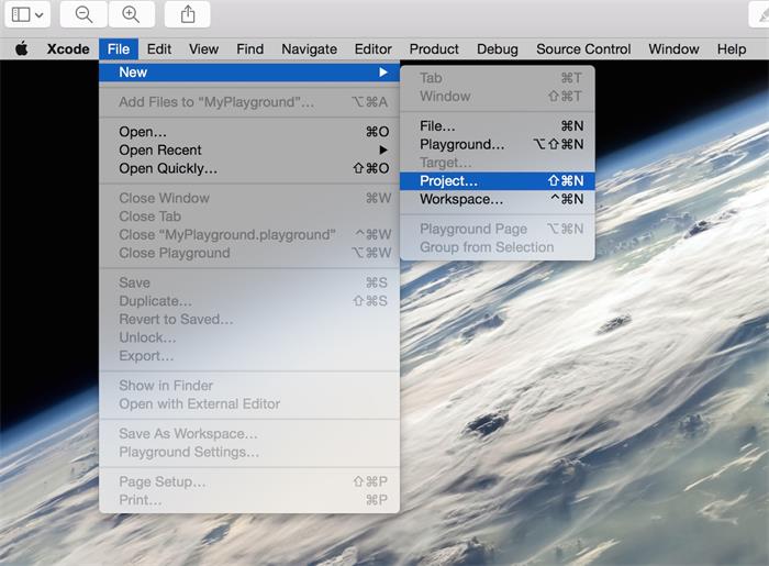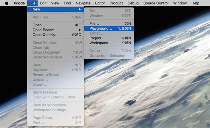 接下来我们在应用文件夹打开 Xcode,打开后在屏幕顶部选择 File => New => Playground。