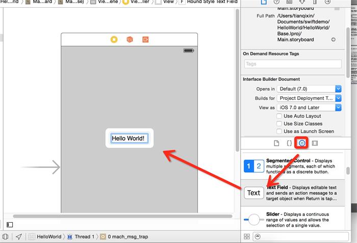 9.我们为界面添加点内容,在右下方找到Text控件,将它拖入storyboard上,并双击写入文本"Hello World!"。