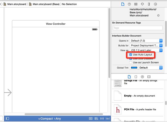 6、打开main.storyboard,默认看到一个简单的空白的应用界面,大小为平板界面大小。 如果开发都只需要开发兼容iphone手机的app,那么可以把Use Auto Layout的勾去掉(默认为勾上)。